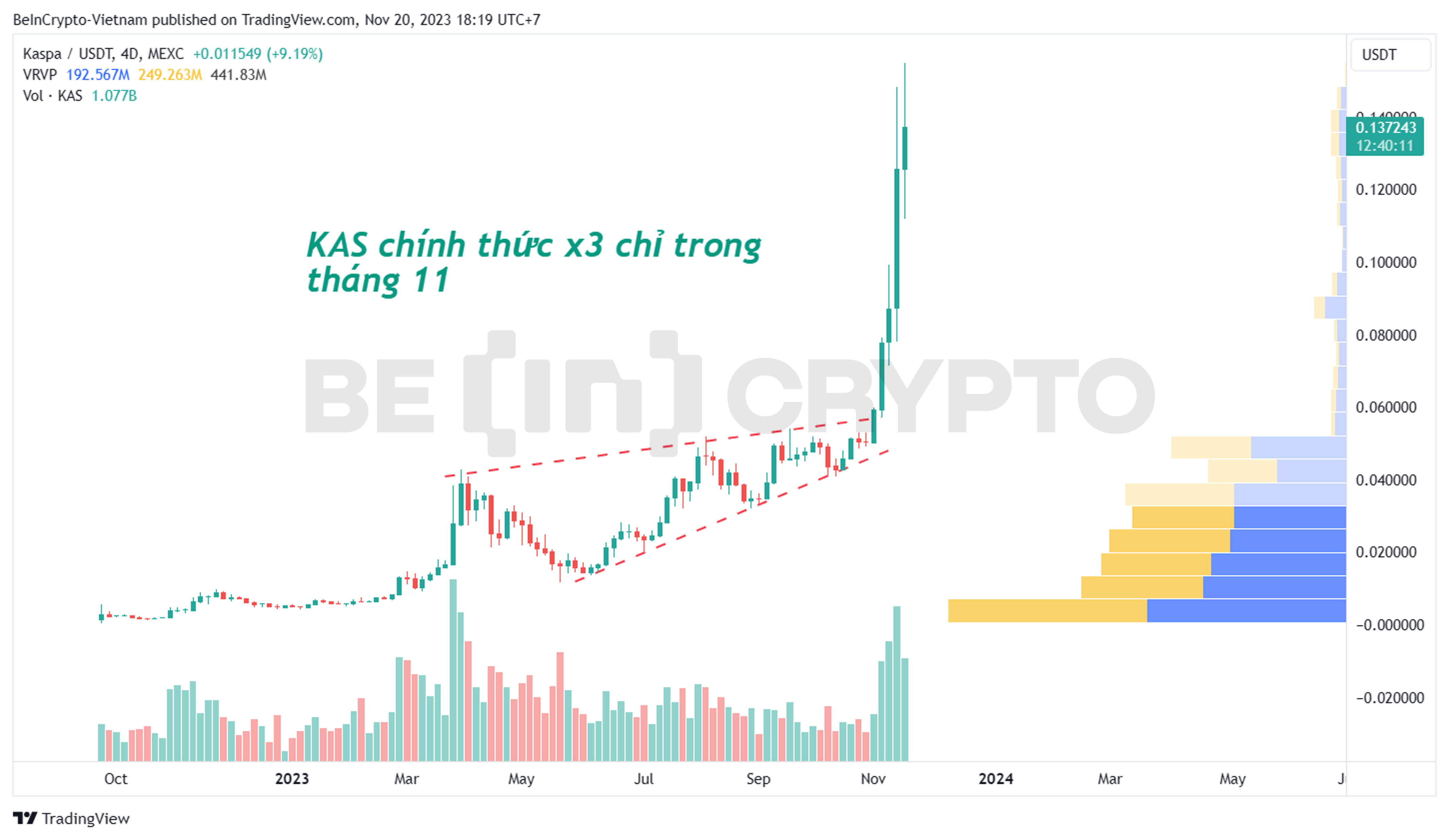 Kaspa (KAS) thật sự nhận được sự chú ý đáng kể của cộng đồng trong tháng 11 với mức tăng gấp 3 lần trong chưa đầy 3 tuần. Còn đường giá trước đó cho thấy, giá KAS như chưa hề trải qua downtrend. Tính từ mức thấp của năm 2020, giá KAS đã tăng đến 70 lần, 0.002 USD đến 0.15 USD.