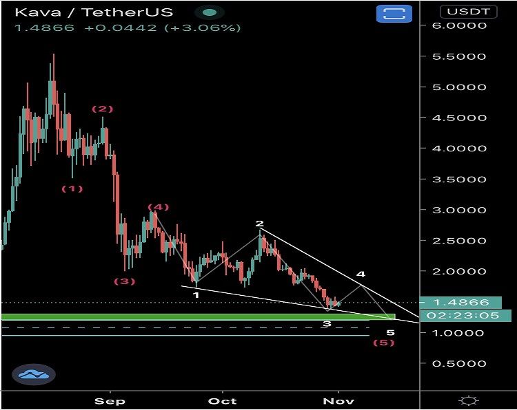 Nhà giao dịch tiền điện tử @Mesawine1 đã chia sẻ một biểu đồ KAVA, cho thấy giá sẽ giảm một lần nữa, trước khi cuối cùng chuyển động đi lên cao hơn hướng tới 3 USD.