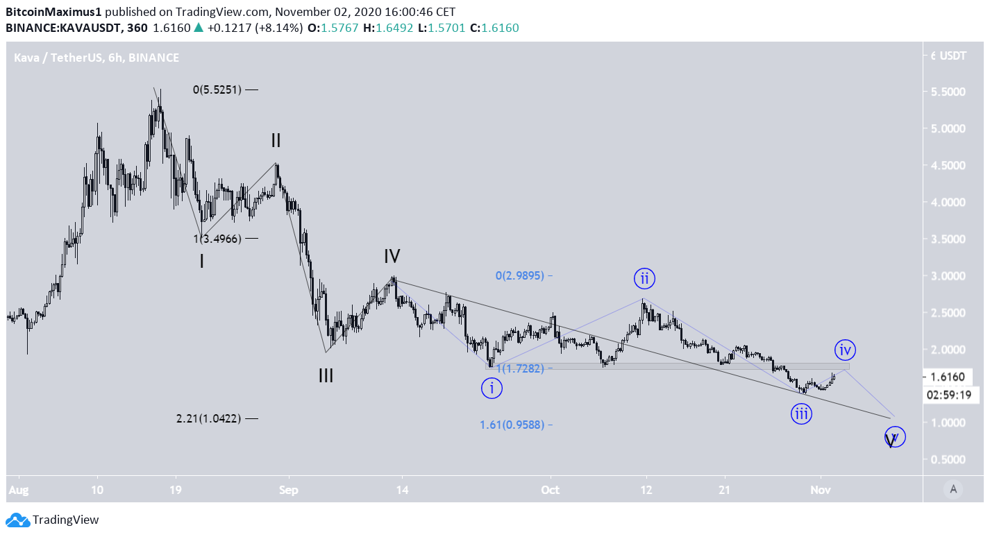 Đếm sóng cho thấy, giá của KAVA sẽ tạo ra một đáy cuối cùng gần 1 USD trước khi dịch chuyển đi lên.