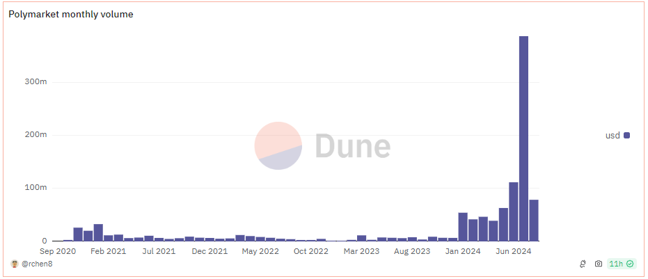 Bức thư không đề cập đến các nền tảng cụ thể nhưng theo sau một kỷ lục cao mới cho nền tảng thị trường dự đoán Polymarket. Theo dữ liệu từ bảng điều khiển Dune, khối lượng hàng tháng của Polymarket đã đạt 387.03 triệu USD vào tháng 7. Sự gia tăng này được thúc đẩy bởi sự mong đợi và cuộc thảo luận xung quanh các cuộc bầu cử sắp tới ở Mỹ vào tháng 11.
