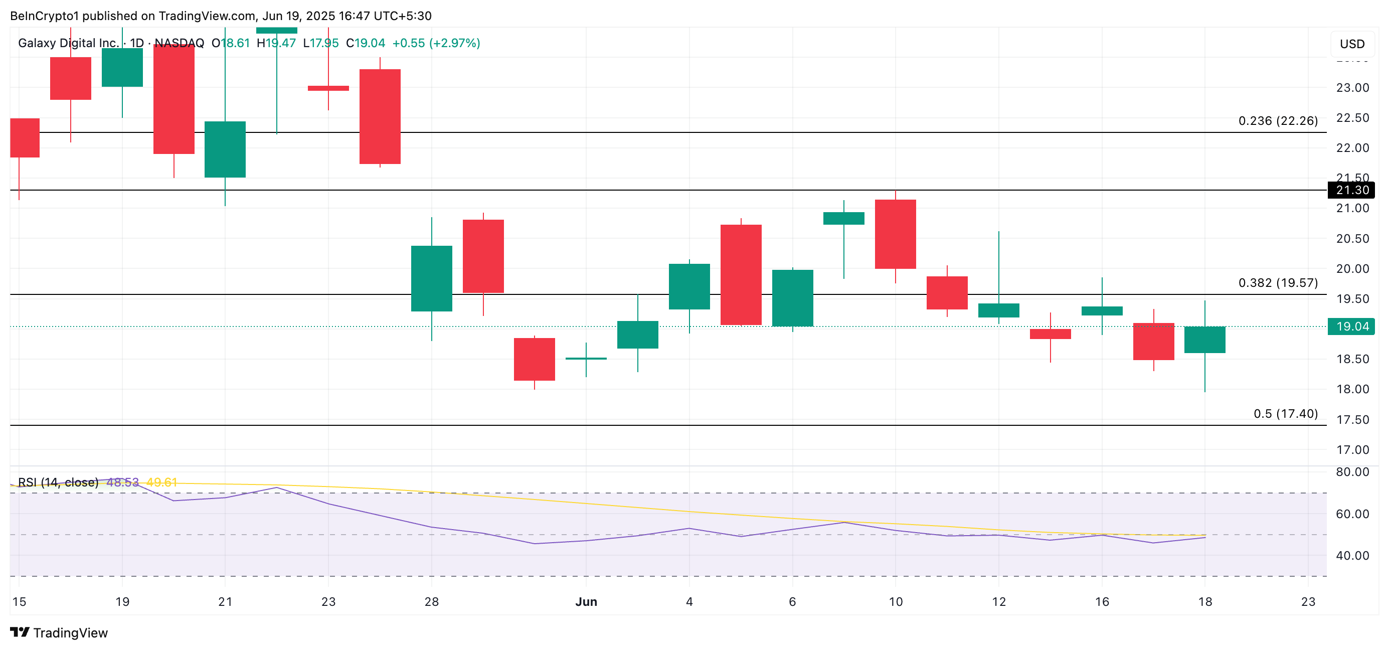 Ở mức 48.53 và đang tăng, RSI của GLXY báo hiệu rằng động lực mua đang gia tăng. Điều này gợi ý khả năng tăng thêm nếu tâm lý lạc quan tiếp tục mạnh mẽ. Trong trường hợp này, giá cổ phiếu có thể vượt qua ngưỡng kháng cự ở mức 19.57 USD và tăng lên 21.30 USD.