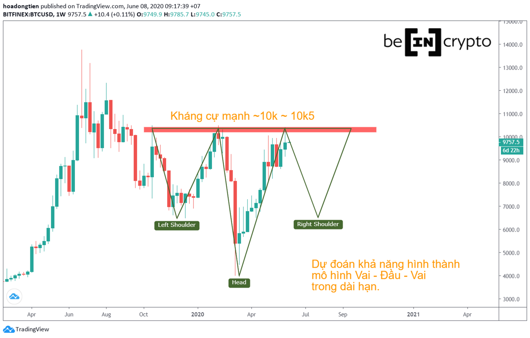 Tuy nhiên, biến động của 2020 lại có biên độ rất rộng. Liên tục trở lại đỉnh vùng ~10.000 đô la nhưng lại vẫn đủ mạnh để tạo thêm đáy mới. Chính vì biên độ rộng như vậy, nên chúng ta mạnh dạn dự đoán mô hình Vai – Đầu – Vai cho những tháng sắp tới.