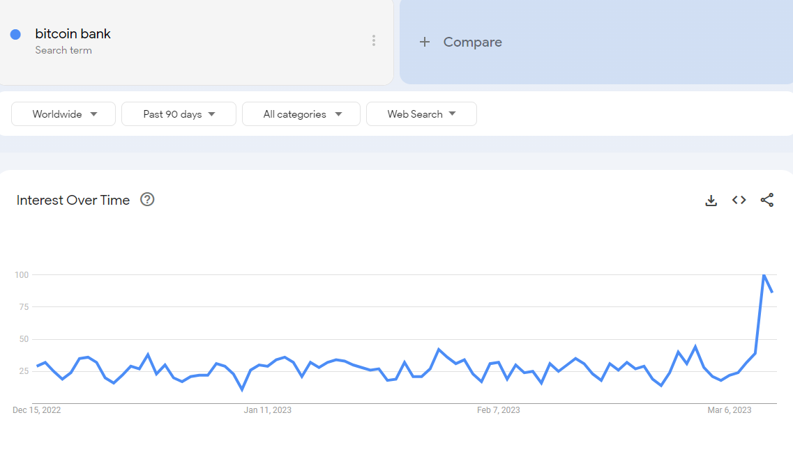 SponsoredDựa theo dữ liệu BeInCrypto ghi nhận từ Google Trends, các lượt tìm kiếm trên toàn thế giới cho cụm từ “Bitcoin bank” đã bùng nổ trong tuần trước, khi giá BTC tăng từ mức thấp 19,662 USD vào thứ 6 lên hơn 26,111 USD vào thứ 3 vừa qua. Xét về một khía cạnh nào đó, hệ thống tiền tệ của Bitcoin không thể yêu cầu một gói cứu trợ nào. Thay vào đó, nó dựa vào các cá nhân trên khắp thế giới, những người cung cấp năng lượng cho mạng và hỗ trợ BTC bằng vốn của chính họ. Như vậy, khi các sự cố xảy ra, Bitcoin vẫn được đem ra so sánh như một giải pháp thay thế hoàn hảo trong tương lai.