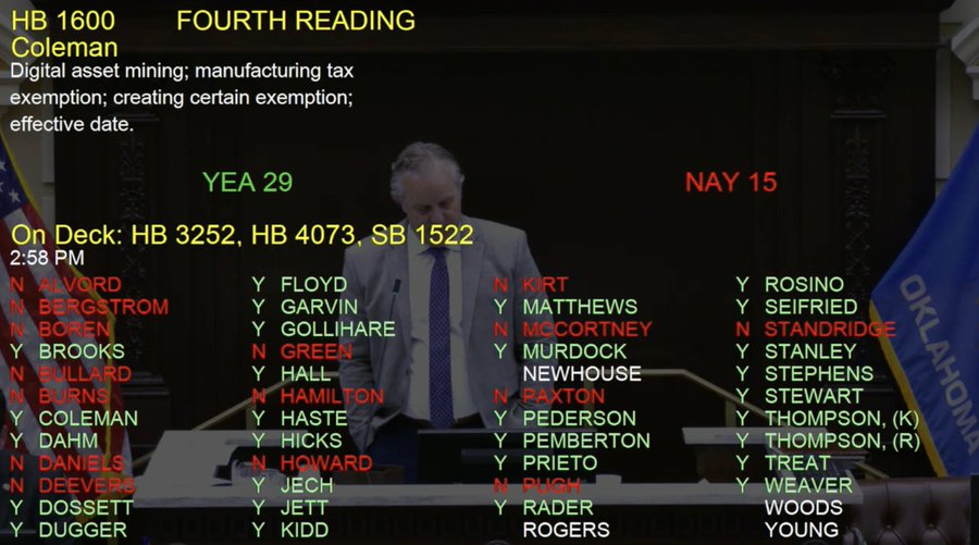 Trong tin tức liên quan, các nhà lập pháp Oklahoma đã thông qua Dự luật Hạ viện 1600 vào ngày 30/5, cung cấp các khoản tín dụng thuế cho các hoạt động khai thác tài sản kỹ thuật số. Dự luật, đang chờ chữ ký của thống đốc, nhằm mục đích miễn thuế cho máy móc khai thác thương mại, bao gồm máy chủ, máy tính và máy biến áp.