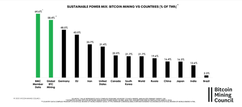 Như bảng trên minh họa, sự kết hợp năng lượng của các thợ mỏ vượt xa so với nhiều quốc gia trên thế giới. Theo số liệu được BMC báo cáo, chỉ có Đức và Anh đang tiến gần đến mốc 50%. Hai quốc gia có tỷ lệ năng lượng tương ứng là 48.5% và 43.5%. Việc sử dụng năng lượng có thể tái tạo sẽ giảm thiểu gánh nặng ô nhiễm.