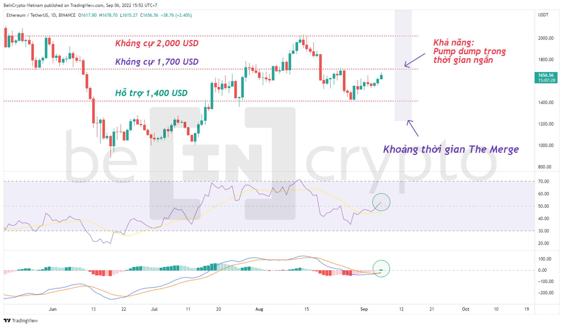 - Việc hạn chế nạp/rút và hạn chế thanh khoản trong thời gian diễn ra The Merge sẽ khiến cho ETH khó thể hiện sự đột biến nào về giá. Do đó, dự đoán ETH có thể biến động “nhiễu loạn” trong thời gian nâng cấp nhưng vẫn không thể vượt kháng cự 2,000 USD.