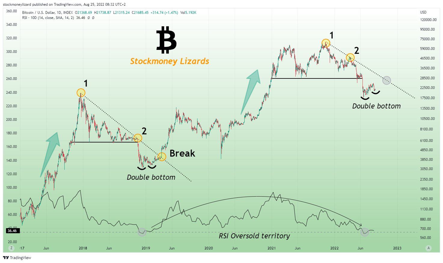 Trước mắt, vùng 22,000 USD tương đương với fibo 0.236 cũng là một kháng cự ngắn hạn. Nó đồng thời cũng khớp với trendline kháng cự của kênh song song (đường màu đen trên hình). Mức kháng cự này dành cho các giao dịch siêu ngắn tần số cao và rủi ro cao.