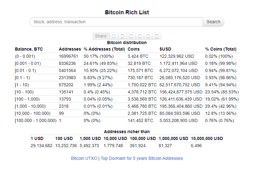 SponsoredDữ liệu sẽ gây khó khăn hơn đôi chút trong việc xác nhận, khi nó không được tổng hợp một cách rõ ràng. Theo BitInfoCharts, có thể lý luận là 2,44% của những ví giàu có nhất sở hữu hầu hết Bitcoin. Tổng thể của tất cả bất kỳ tài khoản nào có từ 1 BTC hoặc nhiều hơn chiếm hơn 94,94% tổng số coin.