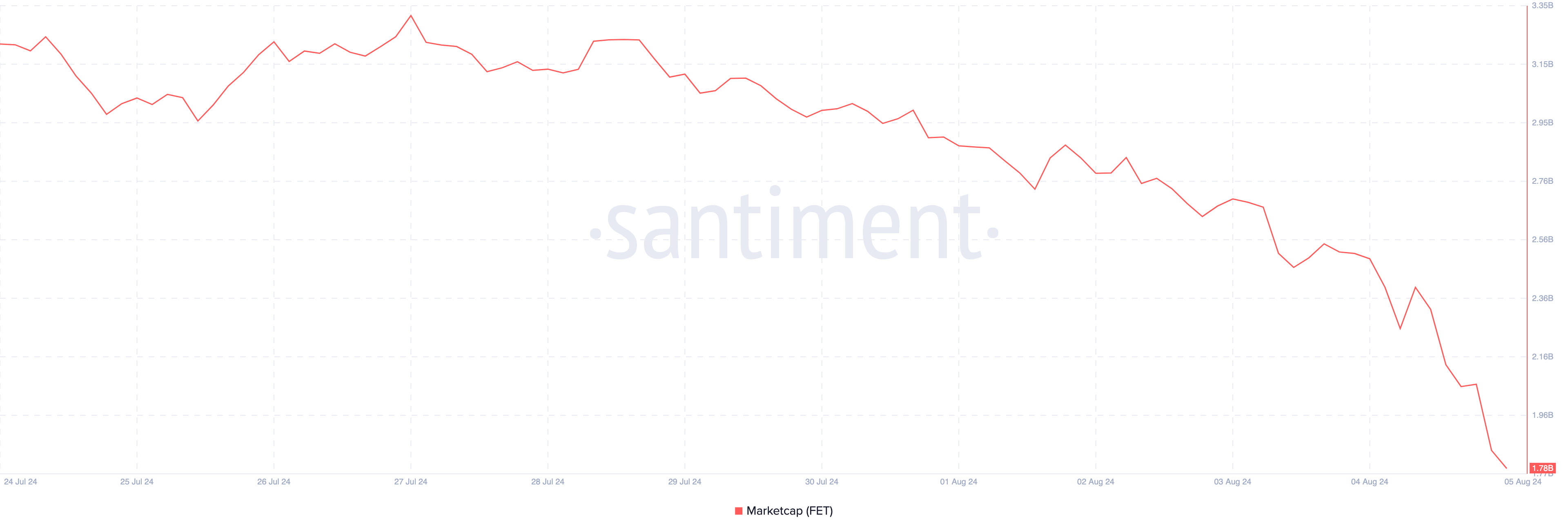 SponsoredMặc dù việc sáp nhập chưa hoàn tất, vốn hóa thị trường của FET đã đạt 3.32 tỷ USD vào ngày 27/07. Đến thời điểm bài viết, token này đã mất một phần đáng kể giá trị vốn hóa, giảm xuống còn 1.78 tỷ USD.