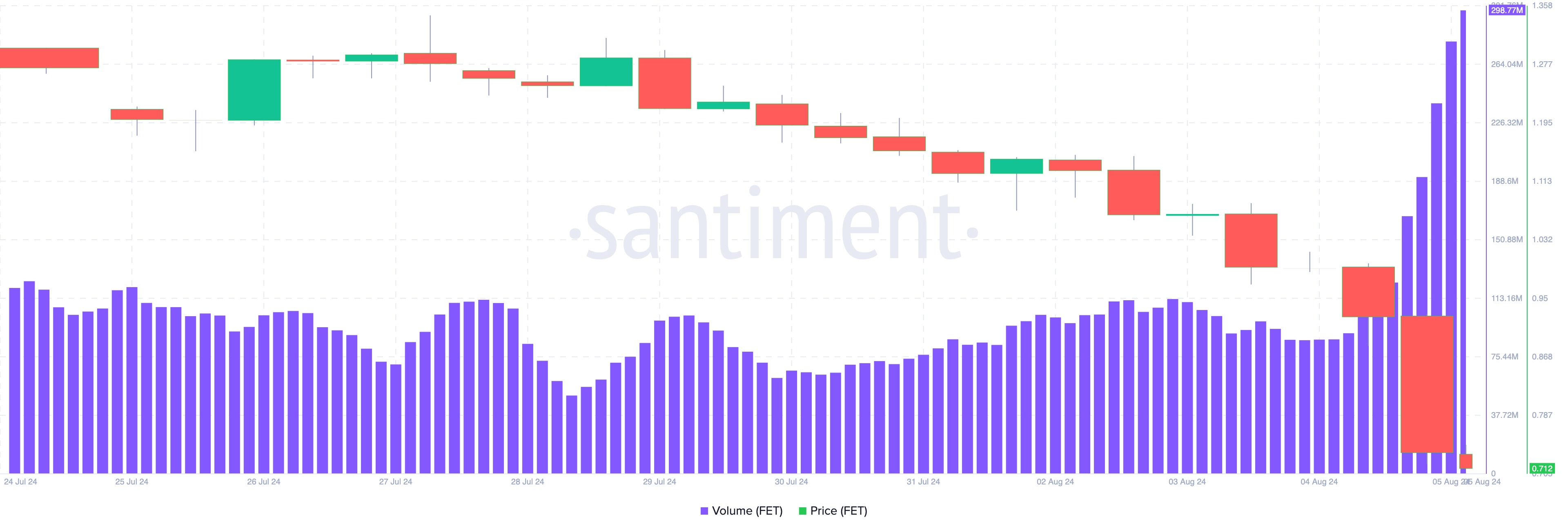 Theo Santiment, trong khi giá FET giảm, khối lượng giao dịch của FET lại tăng vọt một cách đáng kể. Khối lượng giao dịch đo lường tổng giá trị của các token được giao dịch trong một khoảng thời gian nhất định.