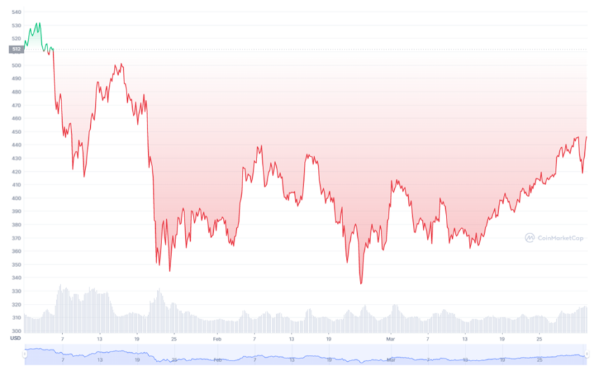 Việc xu hướng thị trường tiền điện tử đi xuống là nguyên nhân dẫn đến khối lượng giao dịch Binance Coin giảm mạnh trong quý đầu tiên của năm 2022.
