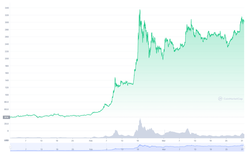 Để so sánh, Binance Coin mở cửa vào ngày 1 tháng 1 năm 2021 ở mức 37.37 USD, đạt mức cao hàng quý là 342.88 USD vào ngày 20 tháng 2 và đóng cửa quý đầu tiên của năm 2021 ở mức 302.06 USD. Nhìn chung, đã có sự gia tăng 708% giữa giá mở cửa và đóng cửa của BNB trong quý 1 năm 2021.
