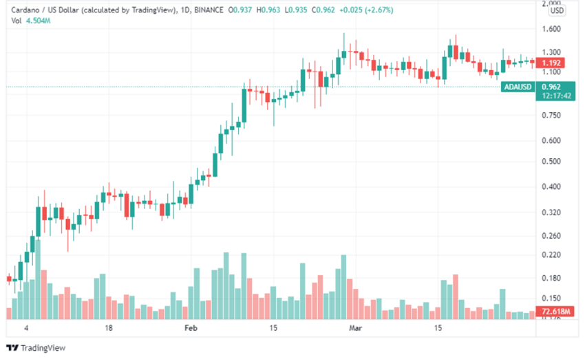 Trong khi đó, ADA đã mở cửa vào ngày 1 tháng 1 năm 2021, với giá giao dịch là 0.1814 USD, đạt mức cao nhất của quý là 1.48 USD vào ngày 27 tháng 2 và đóng cửa quý đầu tiên của năm 2021 ở mức 1.19 USD. Nhìn chung, giá ADA đã tăng 555% trong Quý 1 năm 2021.
