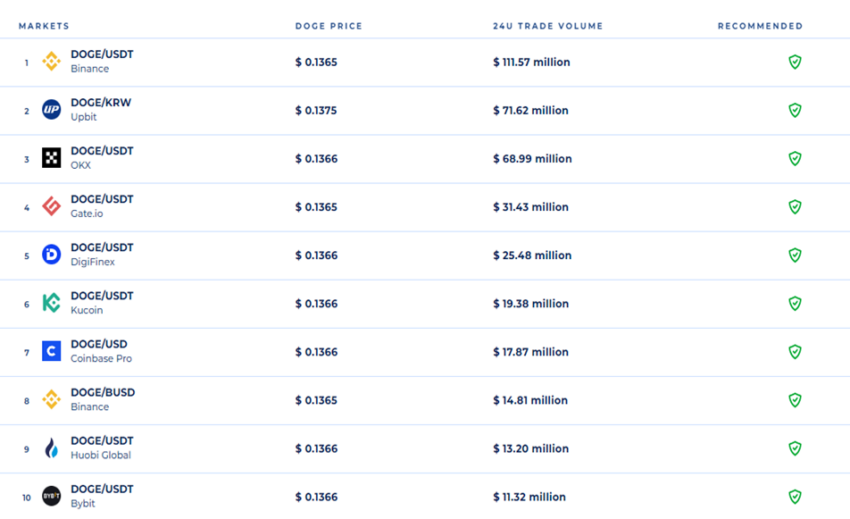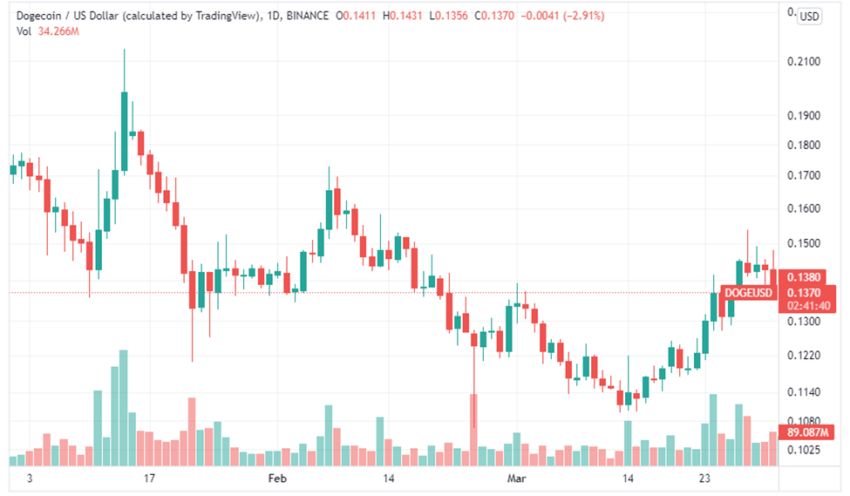Vào tháng 3 năm 2021, khối lượng giao dịch của Dogecoin là 38.71 tỷ USD với mức cao nhất trong một ngày là khoảng 25.4 tỷ USD. Mặc dù giá DOGE phục hồi nhẹ vào cuối tháng, DOGE đã ghi nhận khối lượng giao dịch xấp xỉ 21.55 tỷ USD với mức cao nhất trong một ngày là 2.02 tỷ USD.