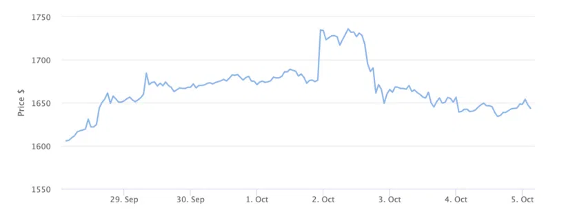 Tuy nhiên, theo một báo cáo gần đây, sau khi ra mắt vào ngày 02/10, Ethereum Futures ETF chỉ thu hút được dòng tiền dưới 2 triệu USD. Giá Ethereum đã tăng khoảng 4.5% để đạt 1,734 USD một ngày trước khi ra mắt (vào ngày 01/10). Tuy nhiên, đà tăng đó đã dừng lại vào ngày 02/10 ở mức 1,659 USD, đánh dấu mức giảm 4%. Tại thời điểm BeInCrypto viết bài này, giá Ethereum là 1,643 USD.