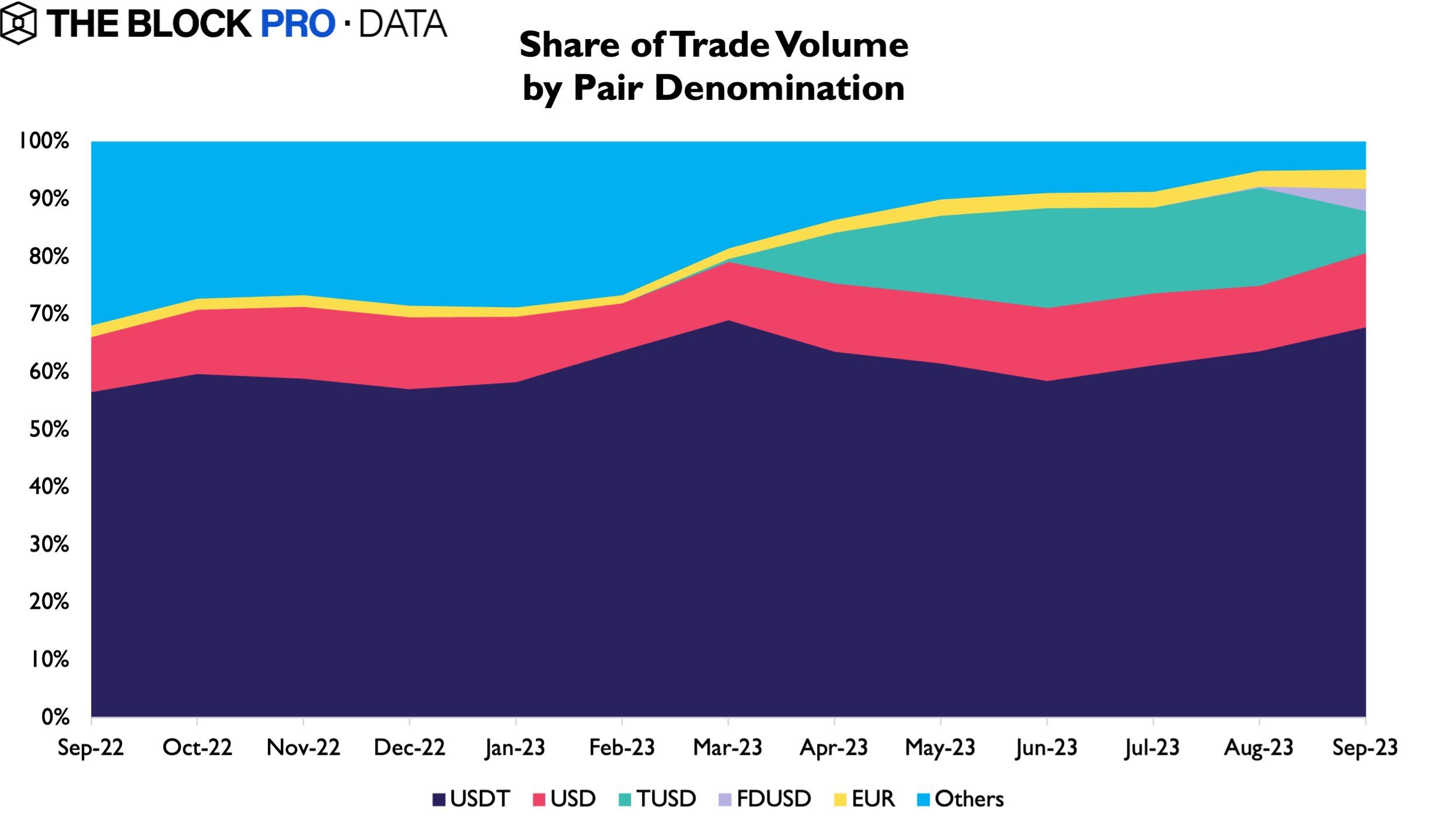 SponsoredDù vẫn chưa đạt đến tỷ trọng 10%, nhưng có thể thấy những stablecoin khác bị thu hẹp thị phần khối lượng để nhường chỗ cho FDUSD. Riêng USDT thì không “nhường” mà tăng trưởng tỷ trọng song song với FDUSD. Và cho đến nay, tỷ trọng khối lượng cặp USDT liên tục duy trì trên 60%.