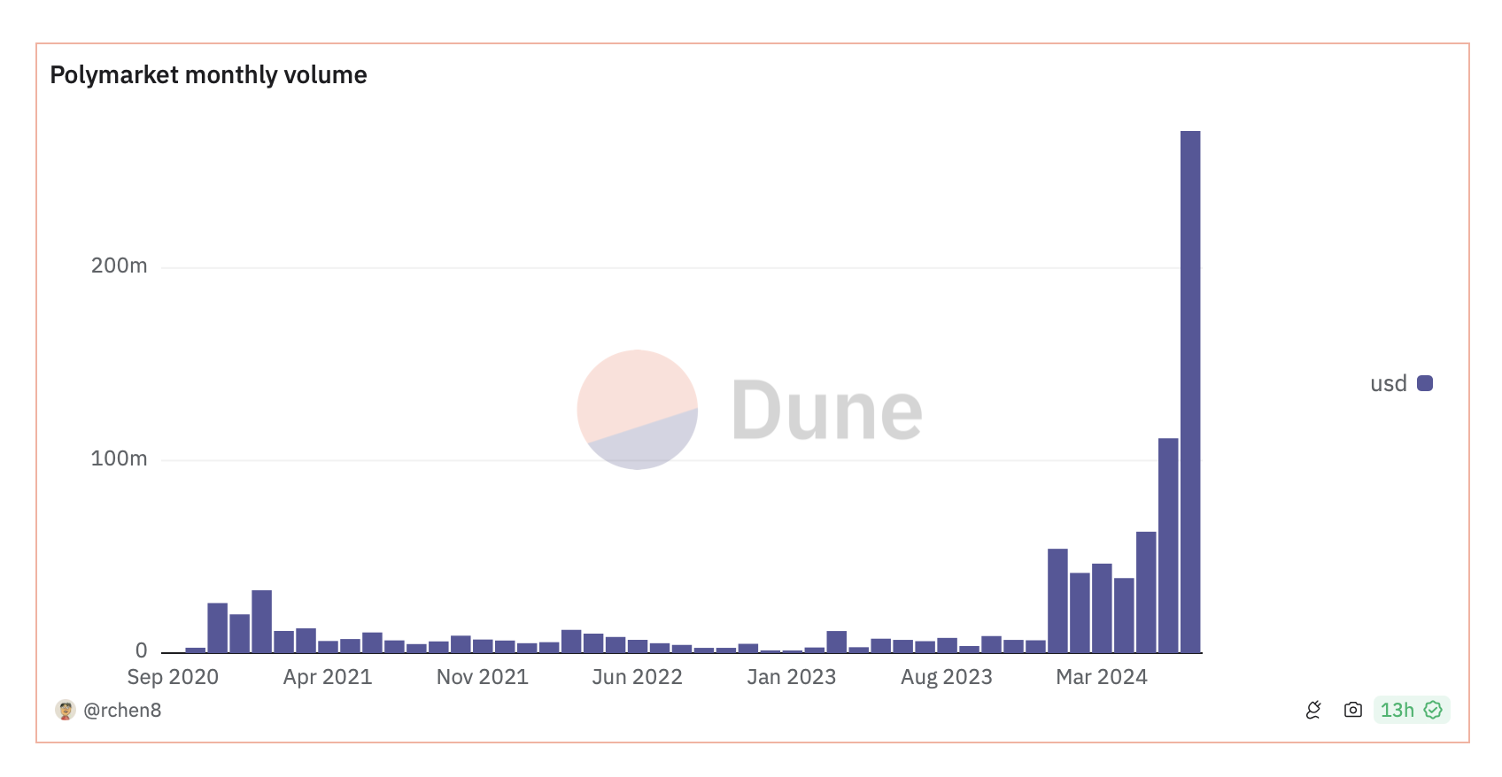 Bên cạnh sự quan tâm ngày càng tăng đối với cuộc bầu cử tổng thống Mỹ, sự tăng vọt về khối lượng giao dịch hàng tháng của Polymarket cũng chỉ ra sự chấp nhận tiền mã hóa ngày càng tăng. Khi thị trường TradFi vẫn còn biến động và khó đoán, nhiều nhà đầu tư hơn chuyển sang các nền tảng phi tập trung như Polymarket để đảm bảo các cược của họ.