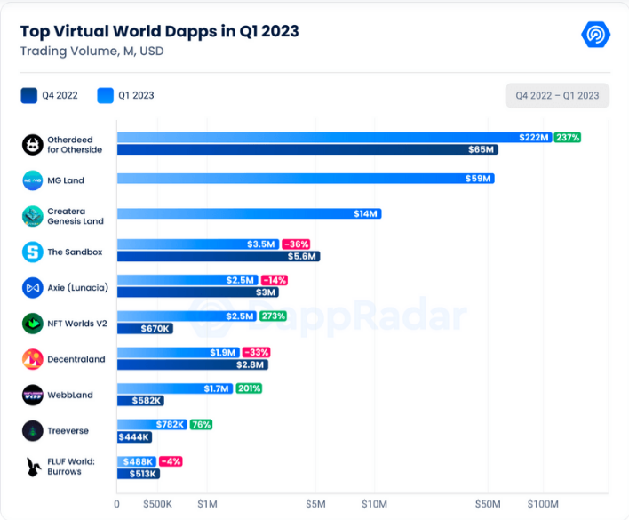 Một báo cáo DappRadar chỉ ra rằng khối lượng giao dịch NFT đất ảo đã tăng 277.12% trong Q1/2023, đạt 311 triệu USD.