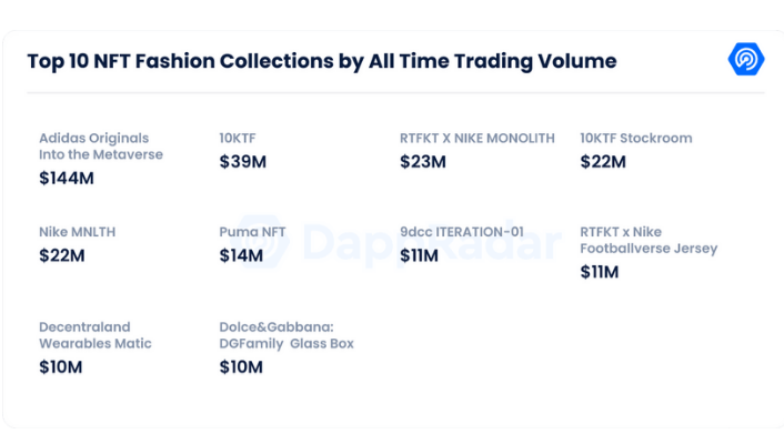 Quý đầu tiên của năm 2023 cũng chứng kiến sự gia tăng của các thương hiệu thời trang cao cấp trong không gian ảo với các bộ sưu tập thời trang NFT. Các bộ sưu tập phổ biến nhất bao gồm Adidas Originals Into the Metaverse, Nike MNLTH, Decentraland Wearables Matic và 10KTF. Bộ sưu tập 10KTF chiếm 74% khối lượng giao dịch của các mặt hàng thời trang NFT. Yuga Labs đã mua lại bộ sưu tập 10KTF, được ra mắt vào năm 2021.