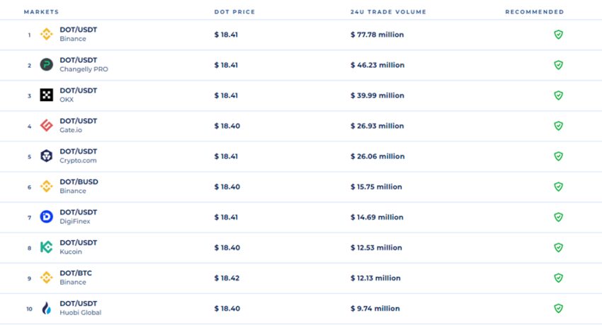 Vào tháng 3 năm 2021, khối lượng giao dịch Polkadot là 72.09 tỷ USD với mức cao nhất trong một ngày là 3.75 tỷ USD. Tuy nhiên, đến tháng trước, khối lượng giao dịch đã giảm xuống còn khoảng 29.93 tỷ USD, với mức cao nhất trong một ngày là 1.66 tỷ USD.