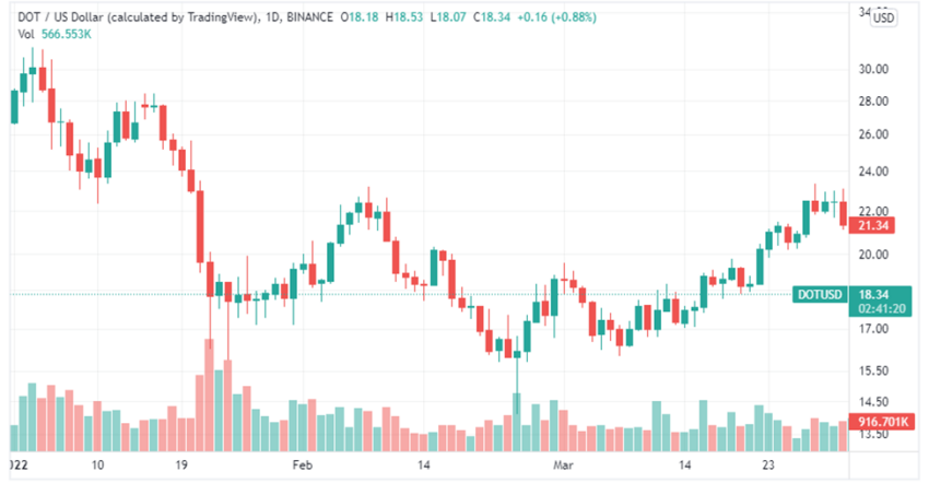 Polkadot mở cửa vào ngày 1 tháng 1 với giá giao dịch là 26.72 USD, đạt mức cao trong quý là 30.83 USD vào ngày 3 tháng 1 và đóng cửa quý đầu tiên của năm ở mức 21.30 USD. Nhìn chung, giá DOT đã giảm 20% trong quý 1 năm 2022.