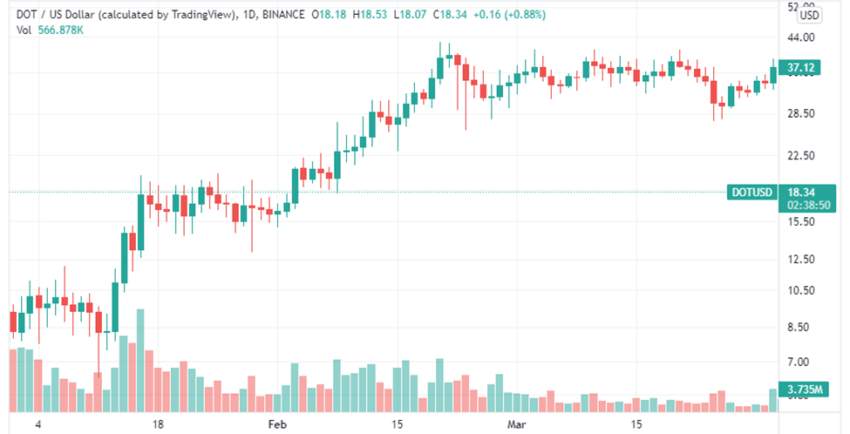 Để so sánh, Polkadot mở cửa vào ngày 1 tháng 1 năm 2021, với giá giao dịch là 9.29 USD, đạt mức cao trong quý là 42.06 USD vào ngày 20 tháng 2 và đóng cửa quý đầu tiên của năm 2021 ở mức 37.03 USD. Theo đó, DOT đã tăng 298% trong quý 1 năm 2021.