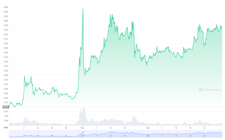 Mặt khác, XRP mở cửa vào ngày 1 tháng 1 năm 2021, với giá giao dịch là 0.220 USD , đạt mức cao hàng quý là 0.745 USD và đóng cửa quý đầu tiên của năm 2022 với mức giá 0.574 USD.