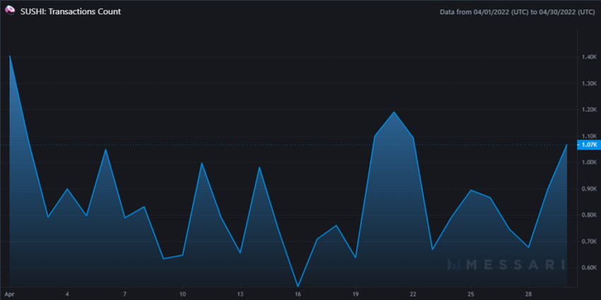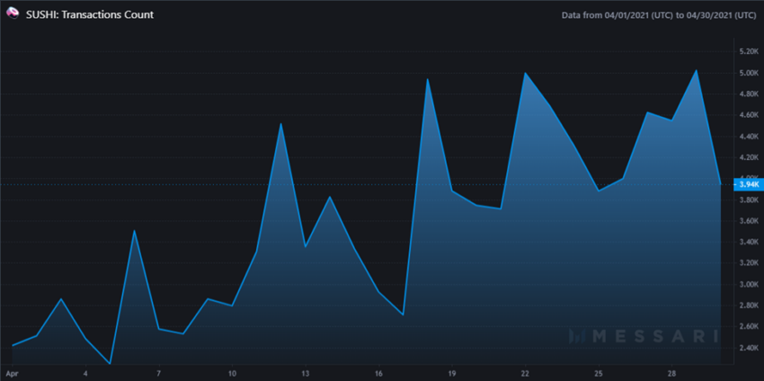 Sponsored SponsoredSố lượng giao dịch trên SushiSwap vào tháng 4 năm 2021 là 106,997 với mức cao nhất trong một ngày là 4,996.