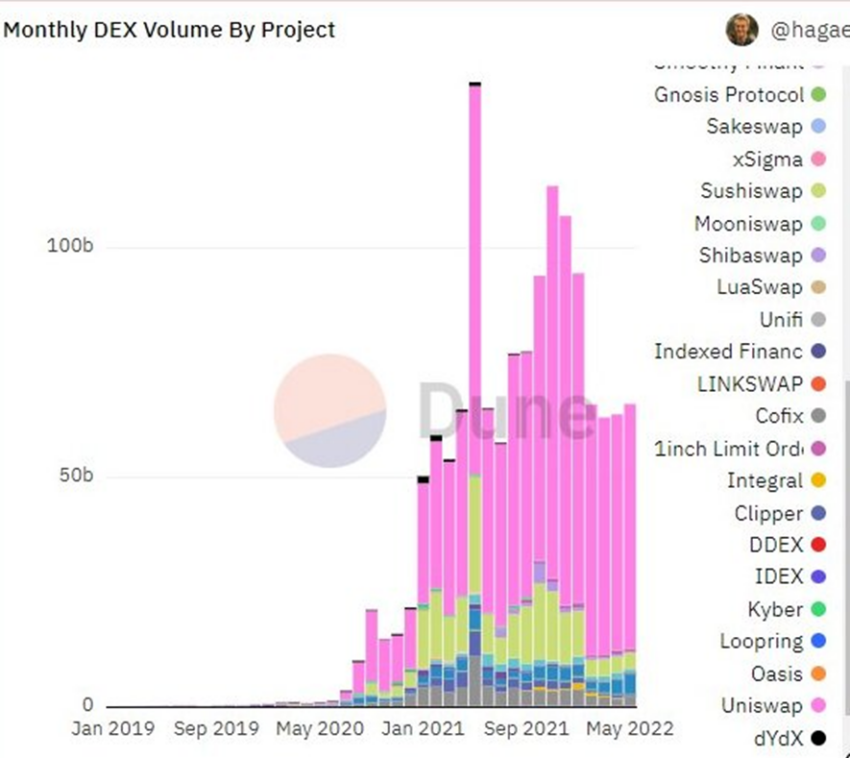 Tháng 4 được chứng minh là một tháng khó khăn đối với các sàn giao dịch phi tập trung, trong đó có SushiSwap. Theo đó, DEX này đã ghi nhận khối lượng khoảng 3.45 tỷ USD trong tháng thứ tư của năm 2022, theo nghiên cứu của BeInCrypto.