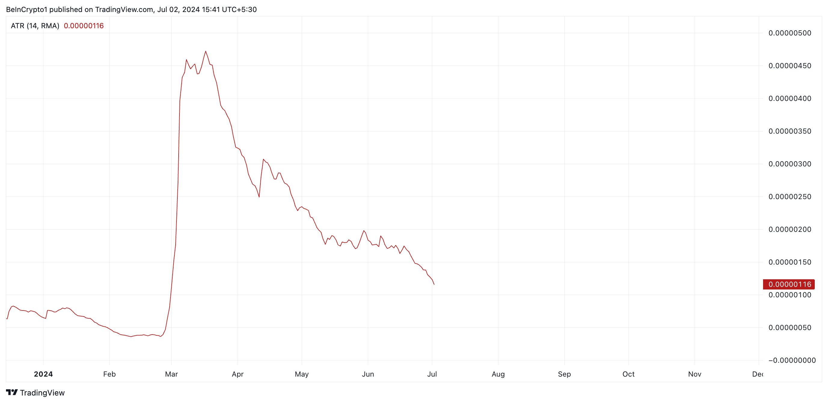 Điều quan trọng cần lưu ý là sự suy giảm hoạt động giao dịch phái sinh thường có liên quan đến sự giảm giá. Chỉ báo ATR (Average True Range) của SHIB trong vài tuần qua xác nhận giá SHIB đi trong một xu hướng giảm. Tại thời điểm viết bài, ATR của SHIB đã giảm 77% kể từ tháng 3, hiện tại là 0.0000011.