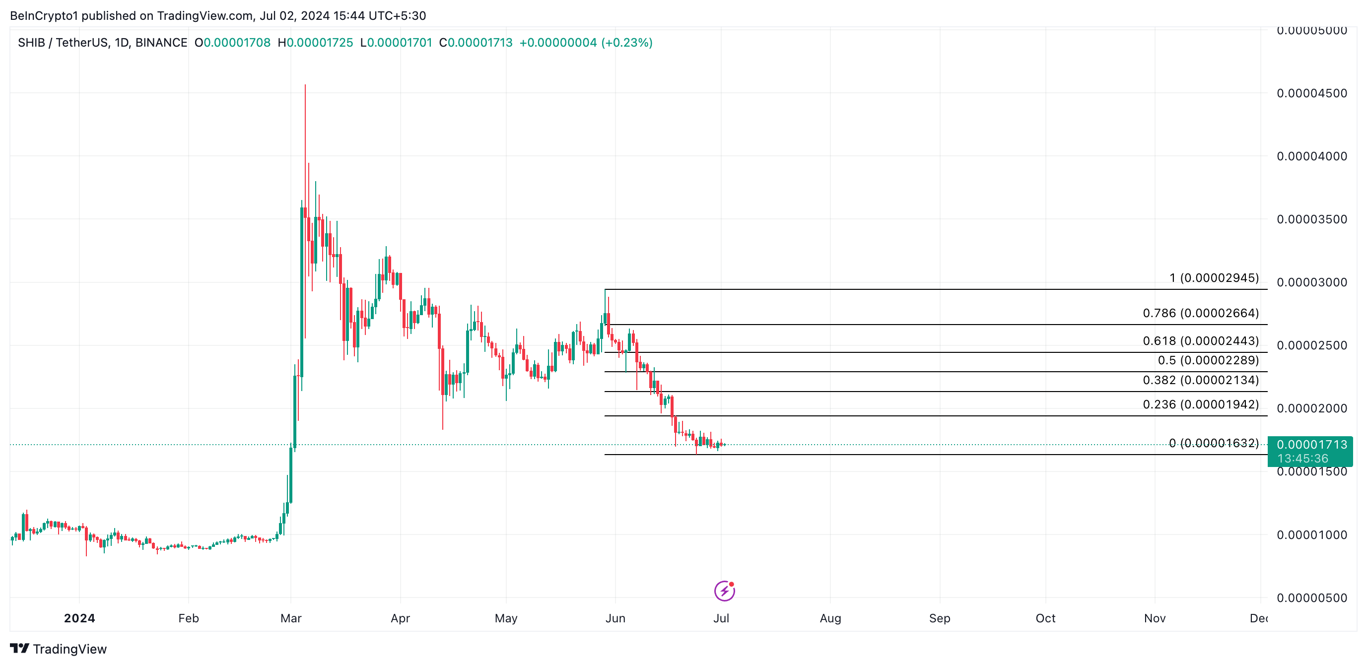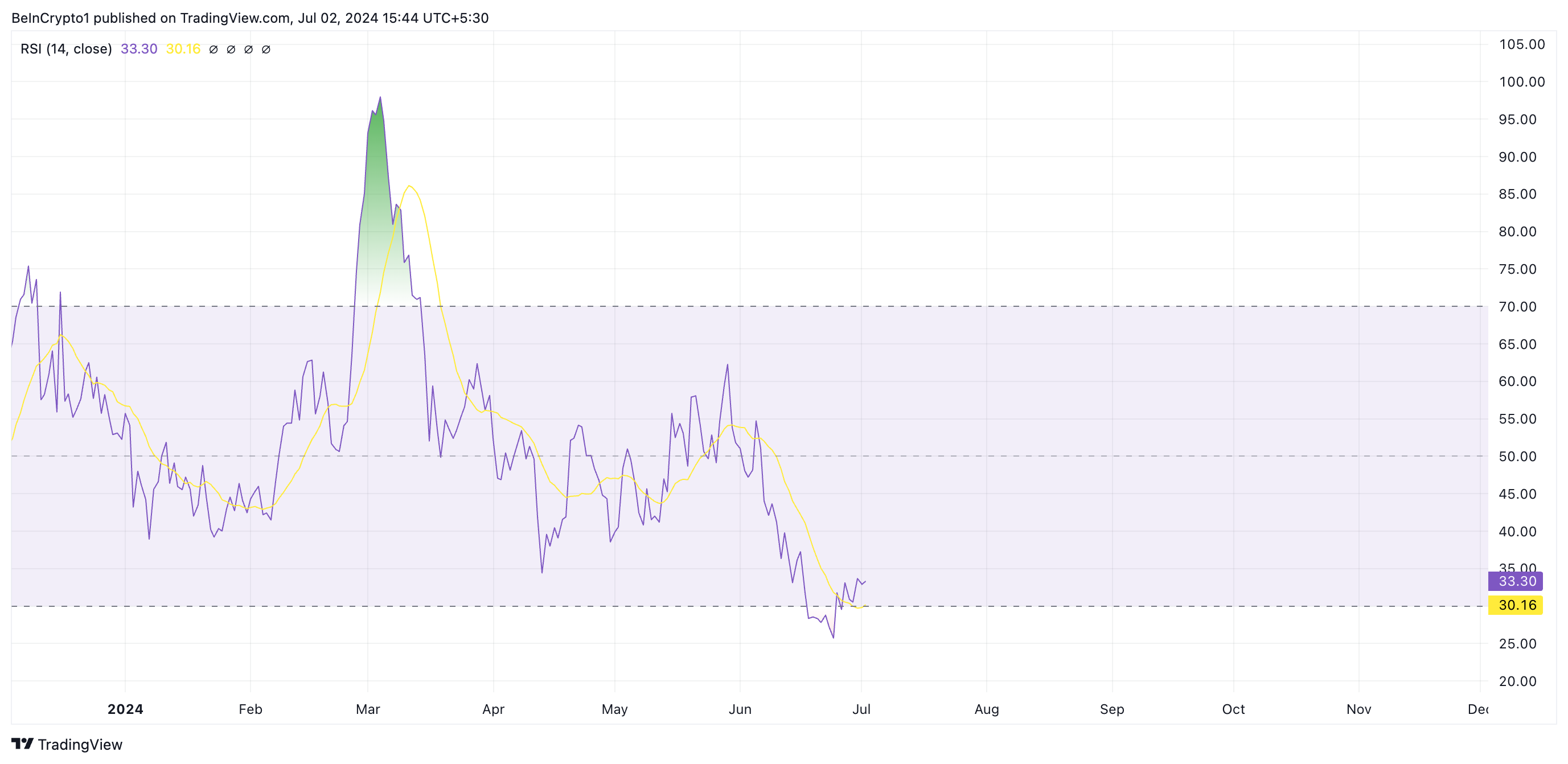 Giá SHIB có thể tiếp tục giảm trong tháng 7 khi sự hào hứng đối với meme coin này đã giảm nhiệt gần đây. Chỉ số sức mạnh tương đối (RSI) của SHIB hiện đã giảm về mức 33.30.