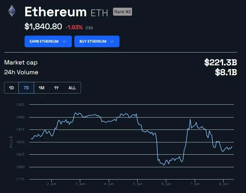 Giá Ether đã giảm mạnh vào ngày 6 tháng 6, nhưng hỗ trợ ở mức 1,800 USD đã được giữ vững và tài sản này vẫn nằm trong một kênh giao dịch hẹp trong hai tháng rưỡi qua.