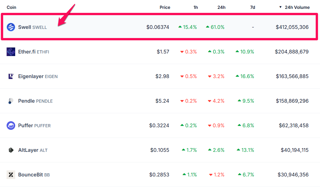 Thời điểm bài viết, giá SWELL đã vượt 0.06 USD và vẫn chưa có dấu hiệu dừng lại. Khối lượng giao dịch 24h qua của đồng tiền này vượt hơn 400 triệu USD, qua mặt các dự án restaking hàng đầu thị trường. Khối lượng gấp đôi Ether.fi (ETHFI), gấp gần ba lần Eigenlayer (EIGEN) và Pendle (PENDLE).