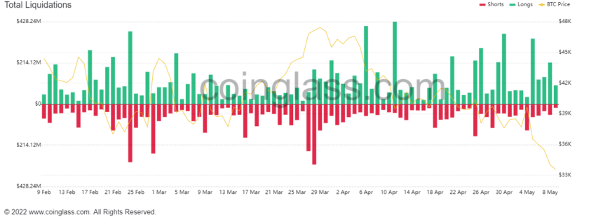 Các nhà giao dịch Ethereum thua lỗ nhiều nhất, với hơn 17,600 ETH đã bị thanh lý, trị giá khoảng 43 triệu USD. Tiếp theo là Bitcoin với 31 triệu USD được thanh lý, sau USD LUNA với 2,77 triệu USD. Phần lớn các giao dịch thanh lý này diễn ra trên OKex, FTX và Binance.