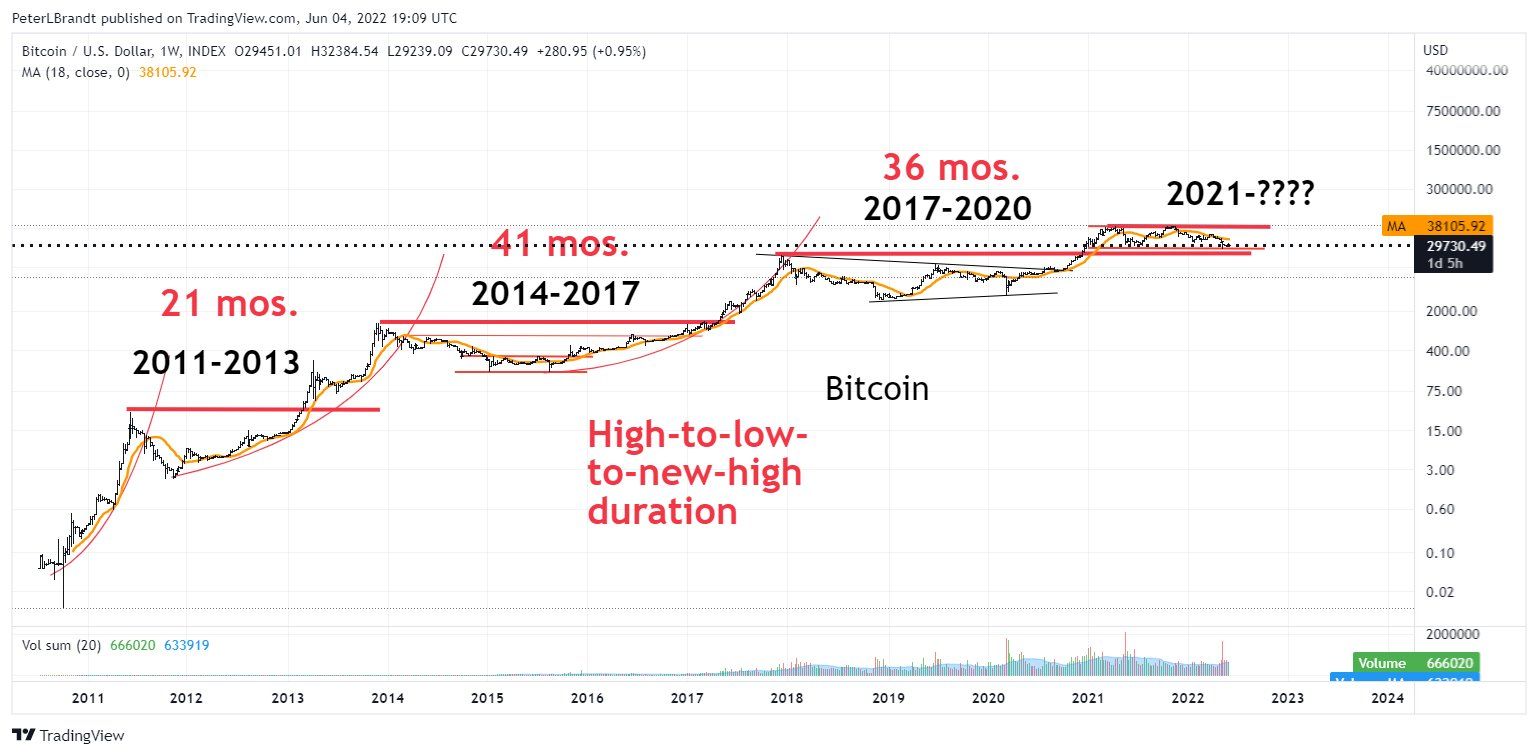- Trong 3 giai đoạn đầu, tính chất cao dần được thể hiện rõ. Tức là ngay cả khi đối diện với những đợt giảm giá mạnh đến -80% đi nữa, thì giá đáy sau không bao giờ thấp hơn giá đỉnh trước. Ví dụ: đáy của giai đoạn 2014 – 2017 không thấp hơn đỉnh của giai đoạn 2011 – 2013. Tương tự, đáy của giai đoạn 2017 – 2020 không thấp hơn đỉnh của giai đoạn 2014 – 2017, dù đã giảm từ đỉnh đến hơn 80%.