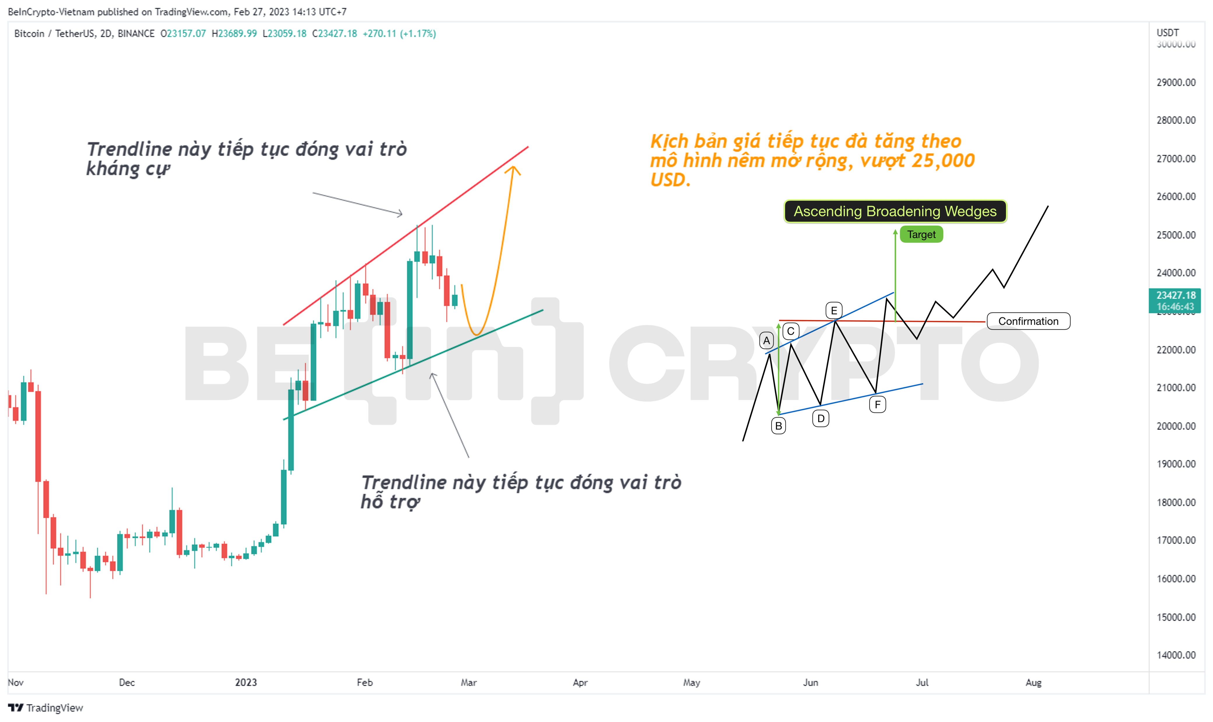 Theo đó, quan sát khung 2D, giá BTC sẽ không điều chỉnh quá đường trendline dưới và sẽ tiếp tục phục hồi cho đến khi chạm đường trendline trên. Với kịch bản này, kỳ vọng giá BTC sẽ vượt 25,000 USD trong tháng 3. Kịch bản mô hình giá này sẽ vô hiệu nếu xuất hiện hành vi giá đóng nến ngày dưới 22,000 USD (vượt quá trendline dưới).