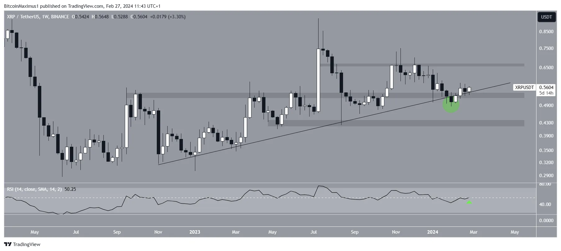 Phân tích kỹ thuật khung thời gian hàng tuần cho thấy giá XRP đã tăng cùng với đường xu hướng hỗ trợ tăng dần kể từ tháng 10/2022. Đường xu hướng đã được xác thực nhiều lần (biểu tượng màu xanh lá cây). Vào đầu năm 2024, giá XRP dường như đã bị phá vỡ khỏi đường xu hướng hỗ trợ tăng dần và vùng hỗ trợ ngang. Tuy nhiên, nó đã lấy lại được vị thế ngay sau đó, khiến mức giảm trở nên sai lệch. Giá XRP đóng cửa trên đường xu hướng và giao dịch phía trên nó.