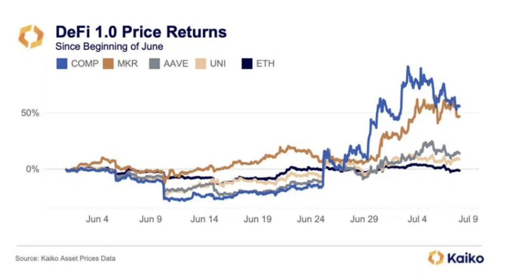 Mặc dù giao dịch này là một ví dụ hoàn hảo về chiến lược thông minh, nhưng ít nhiều nó cũng nêu bật hiệu quả hoạt động của các DeFi token trong 30 ngày qua. Vào ngày 10/7, công ty phân tích blockchain Kaiko đã báo cáo rằng các blue-chip DeFi token đã hoạt động khá ấn tượng trong tháng qua.