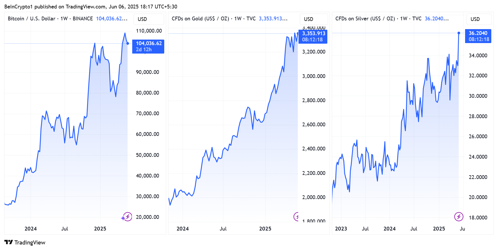 Tại thời điểm viết bài, vàng đã vượt qua mức 3,350 USD mỗi ounce, và Bitcoin đã tăng vượt 104,000 USD, gần đạt mức cao mới. Các nhà phân tích nói rằng sự kém hiệu quả của bạc so với vàng, với tỷ lệ vàng-bạc trên 100, cho thấy nó có thể đang bị định giá thấp.