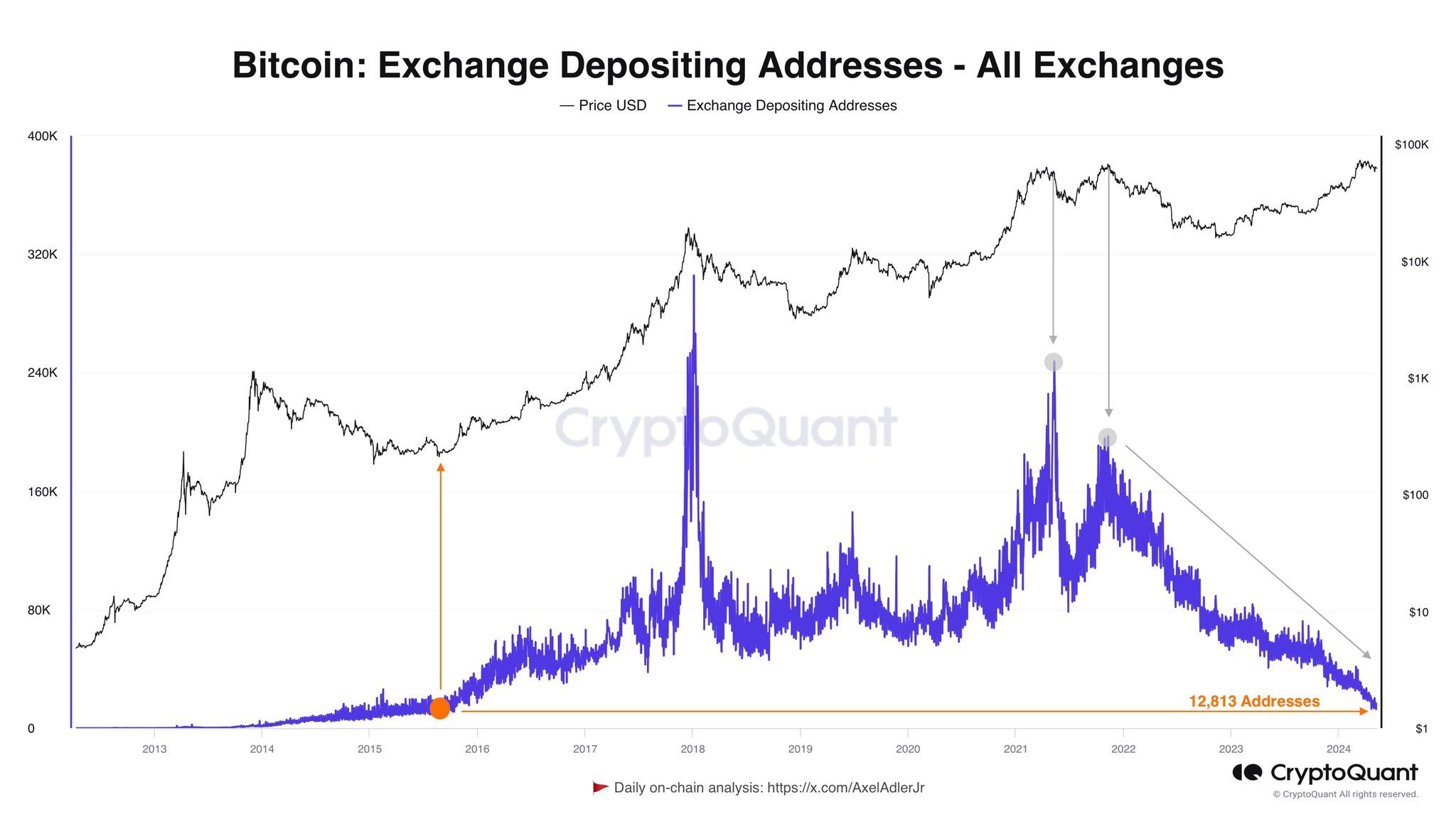 - Cụ thể, đến tháng 5/2024, có khoảng 12,813 ví có hoạt động nạp BTC lên sàn. Đây là mức thấp nhất kể từ tháng 8/2015 cho đến nay. Những holder đã cất trữ BTC trong ví riêng dường như chưa có ý định bán ra. Thật khó để biết khi nào họ sẽ bán ra, nhưng hành vi này cho thấy kỳ vọng của họ vào sự tăng giá BTC là kiên định.