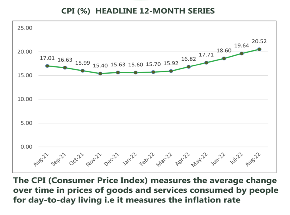 Theo dữ liệu được Cục Thống kê Quốc gia Nigeria (NBS) ghi nhận, tỷ lệ lạm phát tăng lên 20.52% trong tháng 8/2022. So với tháng 8/2021, tỷ lệ lạm phát cao hơn 3.51% và đạt mức cao nhất trong năm 2022. Theo cơ quan NBS, đồng nội tệ mất giá là một trong những yếu tố chính khiến lạm phát tăng đột biến so với cùng kỳ năm trước. Thêm vào đó, tỷ lệ lạm phát ở thành thị (20.95%) có dấu hiện tăng cao hơn nông thôn (20.12%).