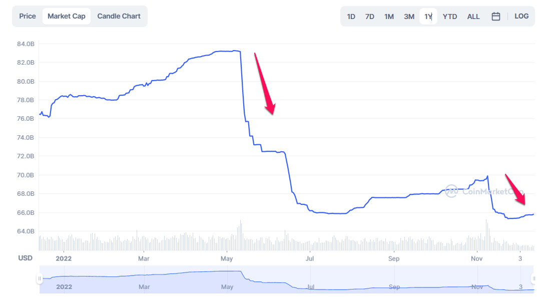 Có 2 đợt vốn hóa Tether giảm mạnh được ghi nhận. Đợt đầu tiên là hồi tháng 5/2022 khi giá BTC chia đôi từ mức ATH. Và chúng ta đang đối diện với đợt rút vốn thứ 2. Thuận theo xu hướng, dự đoán nhu cầu Tether sẽ còn tiếp tục giảm cho đến đầu năm 2023.