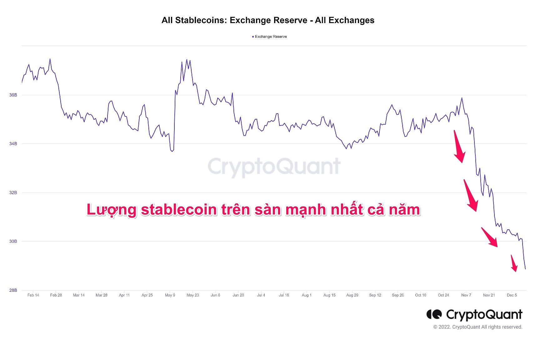 Dữ liệu từ CryptoQuant cho thấy, làn sóng rút tiền stablecoin ra khỏi sàn diễn ra từ đầu tháng 12. Và dữ liệu ghi nhận đà sụt giảm stablecoin trên sàn mạnh nhất trong cả năm 2022. Nhất là gần đây, đà giảm ghi nhận tốc độ rút mạnh hơn khi giảm đến hơn 2 tỷ USD chỉ trong 2 ngày.