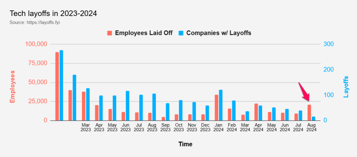 Nhiều tập đoàn và các công ty công nghệ lớn tiếp tục đưa ra quyết định sa thải số lượng lớn nhân viên trong tháng 8. Những quyết định này được đưa ra trong bối cảnh tỷ lệ thất nghiệp của Mỹ có dấu hiệu tăng trở lại, và báo cáo việc làm mới nhất của Mỹ không mấy tích cực.