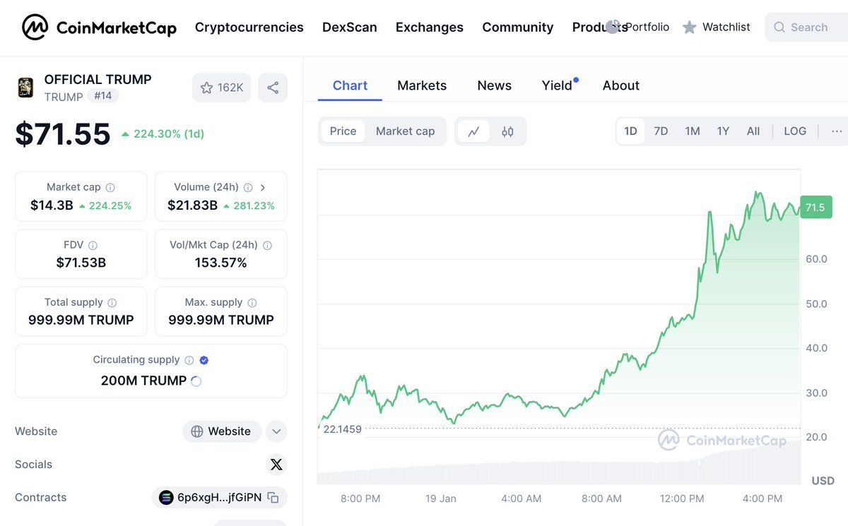 Dữ liệu được BeInCrypto ghi nhận cho thấy khi giá TRUMP coin đạt trên mốc 70 USD, FDV của đồng coin này ở mức trên 71 tỷ USD. Đứng trước con số đầy ấn tượng chỉ trong 24 giờ ra mắt official TRUMP meme coin này, CZ – Cựu CEO của sàn Binance dự đoán sẽ có một làn sóng một số nhà lãnh đạo quốc gia khác có thể đang nghĩ đến việc ra mắt meme coin của riêng mình.