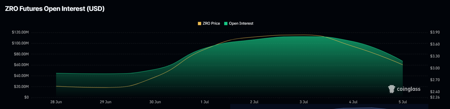 Ra mắt ZRO vào tháng trước đã nhận được sự lạc quan đáng kể nhưng hiệu suất gần đây lại không thể hiện điều tương tự. Trong tuần qua, Open Interest của ZRO đã giảm mạnh gần 50%, từ 112 triệu USD xuống còn 66 triệu USD. Sự sụt giảm đáng kể này cho thấy sự giảm số lượng hợp đồng hoặc vị thế được các nhà giao dịch nắm giữ, báo hiệu hoạt động thị trường giảm sút hoặc sự thay đổi trong tâm lý.