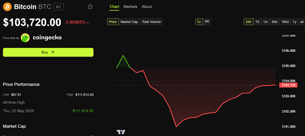 Bitcoin đang giao dịch ở mức 103,720 USD tại thời điểm viết bài, giảm gần 1% trong 24 giờ qua.