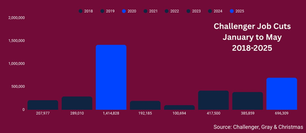 Dữ liệu cũng cho thấy sự suy giảm trong thị trường lao động Mỹ. Theo Challenger, Gray & Christmas, các đợt cắt giảm việc làm vào tháng 05/2025 tăng 47% so với cùng tháng năm ngoái. Các đợt cắt giảm từ đầu năm đến nay (YTD) cũng tăng 80% so với năm 2024.