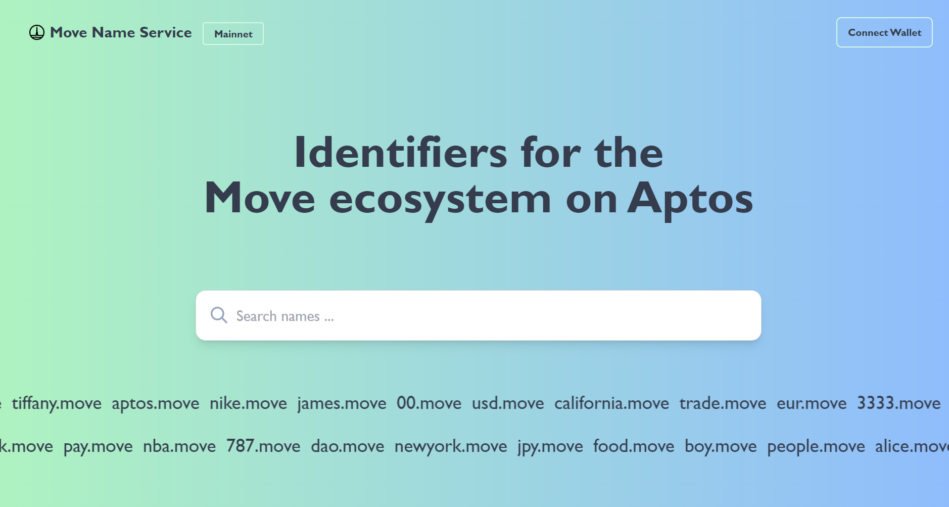 Move Name Service (MNS) là một hệ thống đặt tên trên hệ sinh thái Aptos và Move. Tương tự như Aptos Names, MNS cho phép người dùng Aptos thay thế các địa chỉ ví phức tạp thành tên gọi dễ nhớ nhưng các tên được kết thúc bởi đuôi “.move”. Ngoài ra, người dùng khi đăng ký với Move Name Service cũng có thể được sử dụng làm ID trên Dapp trên Aptos.