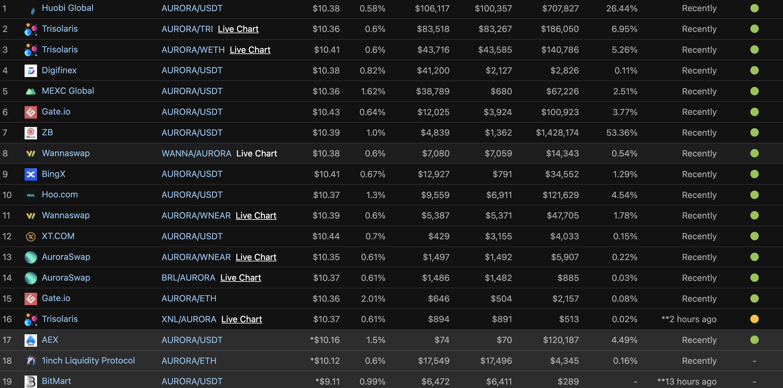 - Sàn giao dịch: Đồng AURORA hiện được list trên một số sàn CEX lớn như Huobi Global hay MEXC Global,… Ngoài ra, người dùng cũng có thể sử dụng một số sàn giao dịch DEX khác như 1inch hay Wannaswap,… Dưới đây là danh sách một số sàn giao dịch hiện đang hỗ trợ.
